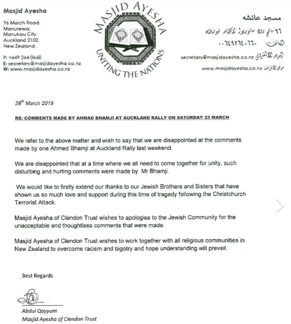 An Auckland mosque has apologised to its “Jewish Brothers and Sisters” for the rant by Ahmed Bhamji at a rally in which he suggested Mossad was behind the Christchurch massacre on March 15