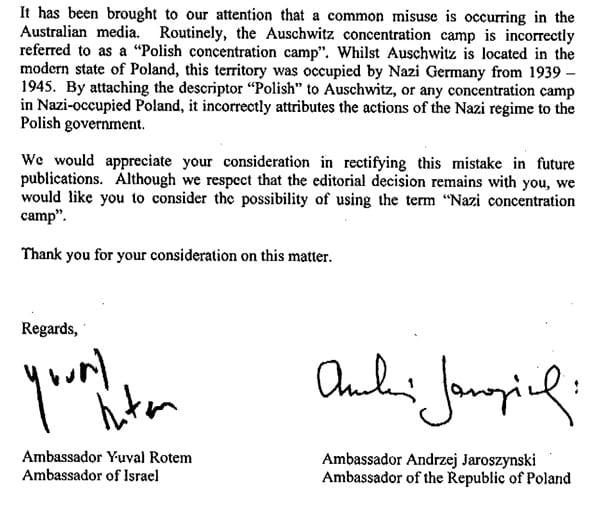 The Polish Ambassador has written in conjunction with the Israeli Ambassador to all major Australian media objecting to Auschwitz being described as a “Polish concentration camp”.
