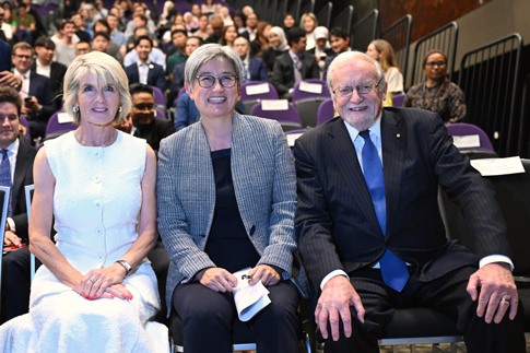 Former Australian Foreign Minister Julie Bishop, Australian Foreign Minister Penny Wong and former Australian Foreign Minister Gareth Evans attend as Malaysian Prime Minister Dato’ Seri Anwar Ibrahim delivers the 2024 Gareth Evans Oration at the Australian National University in Canberra, Thursday, March 7, 2024. (AAP Image/Lukas Coch)