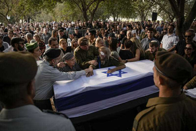 People mourn over the flagged-covered coffin of Israeli soldier Sgt. Amitai Alon, killed by a Hezbollah drone attack, during his funeral near Ramot Naftali, Israel, Monday, Oct. 14, 2024. (AP Photo/Leo Correa)