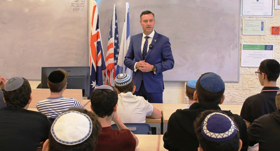 Looking at his rapt young audience, the ambassador revealed, “I grew up in one of the poor areas of Tasmania where I attended a less than mediocre school. Early on, I realised that hard work and education were crucial to my future, and I actually became the first person in my family and the first in my high school to attend university. Most wanted to learn a trade and leave high school as soon as possible. Fortunately, I realised that an education was not only crucial to get my first job, but to live in a range of countries, experience a wealth of cultures, meet fascinating, inspiring people and work on incredible diplomatic issues. I urge you to take full advantage of your outstanding education at Boys Town Jerusalem to advance in your own lives!”