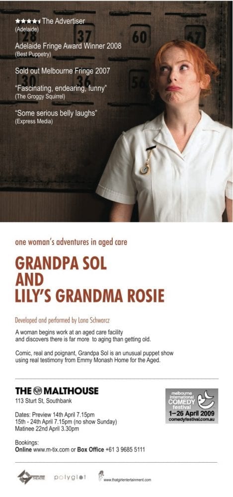 Lana Schwarcz has developed a puppet show dealing with aged care…researched at Melbourne’s Emmy Monash Aged CareA big hit at the Adelaide Fringe Festival, the show is featured at the CUB Malthouse in Melbourne from April 14-24