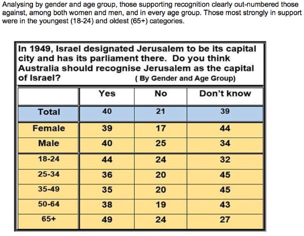 The results paint a very different picture to the published Roy Morgan findings. A key finding of the YouGov survey was that when the question of Jerusalem was framed as one of whether to ‘recognise’ (rather than ‘declare’) Jerusalem as Israel’s capital and was asked without mentioning Trump or the US, Australians supported recognition by a margin of almost two to one (40 to 21 per cent).  Based on party preference, those supporting recognition outnumbered those against in every group except the Greens [scroll down].