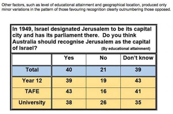 The wording of the question suffered from several defects. It linked recognising Jerusalem as Israel’s capital with Trump, who on any view is a polarising personality. It also mis-characterised Trump’s decision. Trump did not ‘declare’ Jerusalem to be the capital of Israel; the US recognised it as already being Israel’s capital.