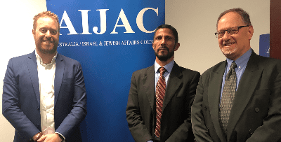 Ismail Khadi (centre), with AIJAC’s Joel Burnie (l) and Tzvi Fleischer (r). Photo credit: Sharyn Mittelman