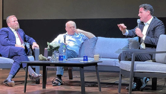 Rabbi Shmuley Boteach; human-rights activist and former chairman of the executive of the Jewish Agency for Israel Natan Sharansky; and former Israeli Ambassador to the United States Ron Dermer take part in a panel discussion on global anti-Semitism at the Menachem Begin Heritage Center in Jerusalem, June 6, 2022. Credit: Courtesy