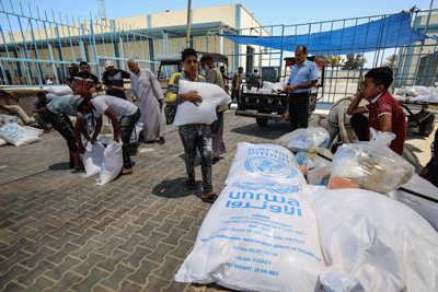 Palestinians receive food aid at an UNRWA distribution center in the southern Gaza Strip town of Rafah on May 26, 2021. Photo by Abed Rahim Khatib/Flash90