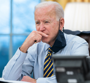 U.S. President Joe Biden participates in a conference phone call in the Oval Office of the White House on Feb. 16, 2021. Credit: Official White House Photo by Lawrence Jackson