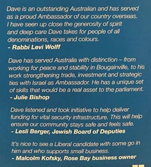The president of The New South Wales Jewish Board of Deputies Lesli Berger has accepted Liberals’ Wentworth candidate explanation that a quote used by Dave Sharma’s team attributed to him on flyers was a misunderstanding.