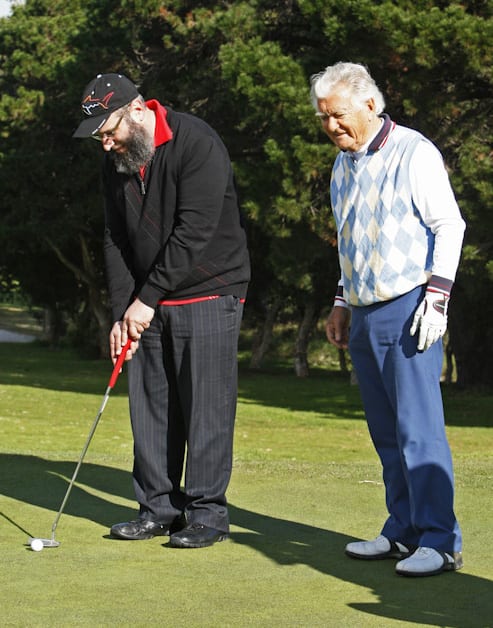 Bob Hawke gives Rabbi Mendel Kastel a putting lesson at the Jewish House Golf Day in 2012. He died on the Jewish House Golf Day 2019. Photo: Jack Hochfeld