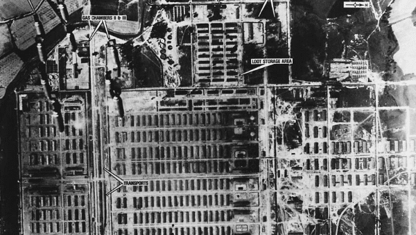 One of a series of aerial reconnaissance photos of the Auschwitz concentration camp taken between April 4, 1944 and Jan. 14, 1945, but not examined until the 1970s. Credit: Wikimedia Commons.