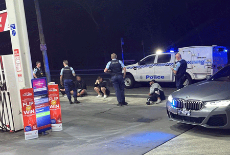 The driver’s side mirror of the hatchback was smashed by a rock, before the vehicle drove away and attended a nearby service station, with the sedan arriving a short time later.