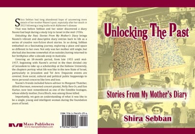 This discovery encouraged her to further explore this early period in Israel, and resulted in her first creative non-fiction work Unlocking the Past: Stories From My Mother’s Dairy.Using the diaries as the scaffolding Sebban had done extensive research to fill out the stories in an interesting combination of historical insight, politics, social parties, and an array of potential suitors. This intriguing mix of the mundane and historic tells this period of Naomi’s life in a series of short and easy to read vignettes.