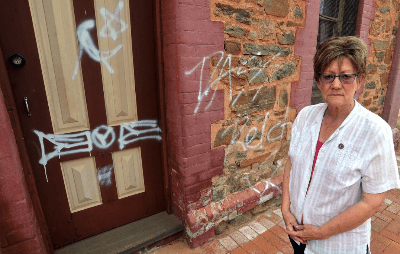 Margaret Price, the co-ordinator of the Synagogue of the Outback Museum told J-Wire: “I arrived at work and found the symbols and slogans across the front of the building which is under the ownership of the Broken Hill Historical Society. I can only ever remember one other such attack about ten years ago when the building was daubed with swastikas on Hitler’s birthday and a bookstore was defaced in 2010 with nazi symbols at this time of year as it featured items being shown in a Jewish promotion for Chanukah. Although there is no Jewish presence in the city these days, I grew up with Jews and my family worked with them. They were Broken Hillers and a strong part of our community. We are dismayed by this scurrilous attack on the building on the very day of its 105th anniversary.”