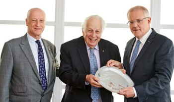 Leon Kempler Chairman AICC, Sir Gustav Nossal and Prime Minister Morrison at this week’s Australia-Israel Chamber Commerce where the prime minister Australia’s decision not to go to Durban
