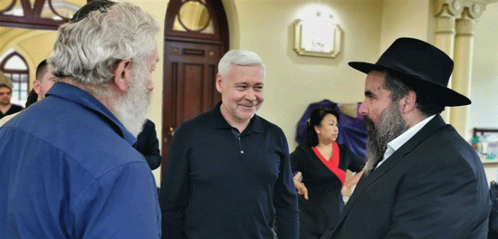 Igor Terechov, the mayor of Kharkiv, Ukraine, made a visit on Tuesday to the Chabad Choral Synagogue, where he met with Rabbi Moshe Moskovitz, the leader of the synagogue and the Jewish community in Kharkiv, as well as local community members who have been living in the synagogue since Russia invaded Ukraine in late February.