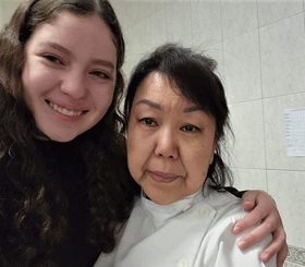 Shaina Moskovitz, daughter of Rabbi Moshe and Miriam Moskovitz, leaders of the Jewish community in Kharkiv, with a cook who helps at the synagogue, May 31, 2022. Credit: Courtesy.