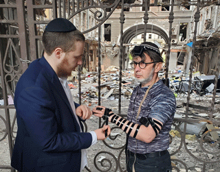 Sholom Ber Moskovitz, son of Rabbi Moshe and Miriam Moskovitz, leaders of the Jewish community in Kharkiv, wraps tefillin with a Jewish resident of the city, May 31, 2022. Credit: Courtesy.