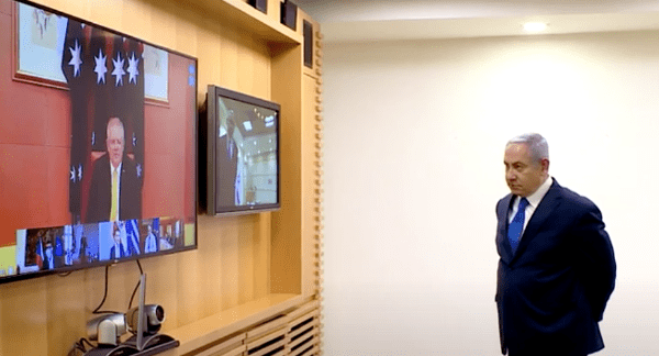 Benjamin Netanyahu teleconferencing with Scott Morrison in April