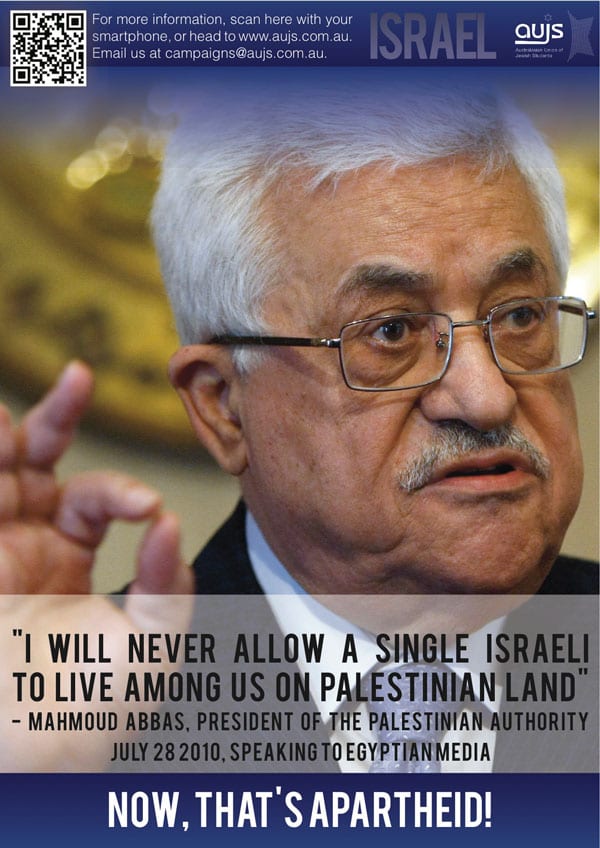 A spokesman for AUJS told J-Wire: “We’ve distributed them to be put up locally in: Victoria, NSW, WA, Queensland, ACT, SA andNew Zealand. They were first put up in Victoria on Sunday night.”