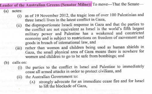 The Greens failure to even mention the millions of Israelis living under constant rocket fire, forced into air raid shelters, exposes them as an extreme left political party. It is ugly that these Australian far left extremists are effectively in bed with the women-hating, gay-hanging Palestinian Islamic Fundamentalists of Hamas. Christine Milne’s resolution’s bias and the political succour gives strength to the Palestinian arm of the Muslim Brotherhood, Hamas. This resolution shows what a political dead-end the Greens have come to.