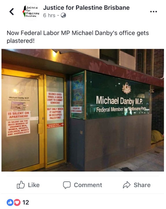 Anti-Israel extremists have defaced the office of Labor MP Michael Danby’s electoral office in Melbourne’s St Kilda sometime on Saturday night.