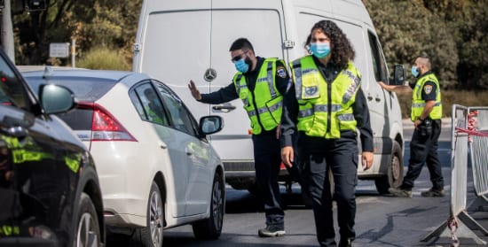 Israeli Police at a temporary “checkpoint” in Jerusalem, on September 22, 2020, during a nationwide lockdown. Photo by Yonatan Sindel/Flash90