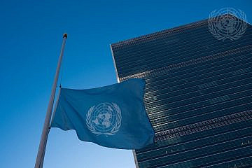 The U.N. flag is lowered to half-mast at the headquarters of the world body in New York City to honour colleagues killed in the Gaza Strip, Nov. 13, 2023. Credit: Evan Schneider/U.N. Photo.