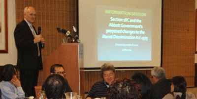 Over  100 people, including community leaders and academics, have attended a meeting in Sydney convened by the Chinese Australian Forum to discuss the Federal government’s proposals to alter parts of the Racial Discrimination Act which prohibit racial vilification.