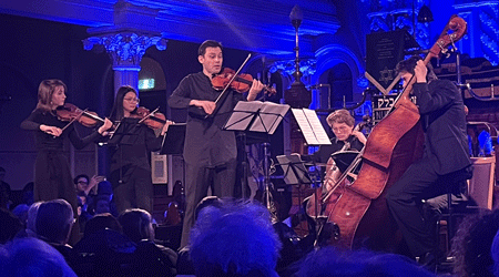 “In action” describes Winther very well. We could have watched him perform all night. He is charismatic and expressive both in his music and his body which spoke volumes towards the character of the music. His face would screw up or relax, smile or frown and make eye contact as needed with his amazing ensemble. He was incredibly virtuosic on his violin, able to whizz up and down the strings at incredible speed and volume. He played warm and lovingly as well as lusciously and softly, making the violin an extension of his own body.