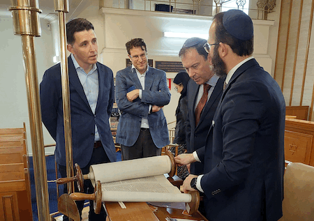 Minister Brooks alongside Ryan Batchelor, Labor Member for Southern Metropolitan, toured the synagogue. They learned about the key features of the synagogue and heard about the Caulfield Shule community from Rabbi Daniel Rabin, synagogue President Dr Howard Zeimer and Vice-President Ruth Kurc.