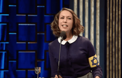 Jeff Ross, the host, who is Jewish, dons a yellow Star of David armband and remarks that “genocides continue to take place around the world.”