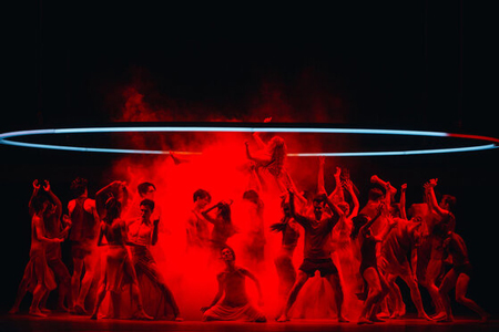 Call it circle work, in the nicest possible way, if you would care to for in large part dancers work under a large lit circular ring, which moves up and down and pivots.