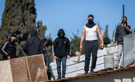 Palestinians with gas cylinders stand on a rooftop of a house being evacuated by Israeli special forces, in the East Jerusalem neighbourhood of Sheikh Jarrah, on January 17, 2022. Photo by Yonatan Sindel/Flash90