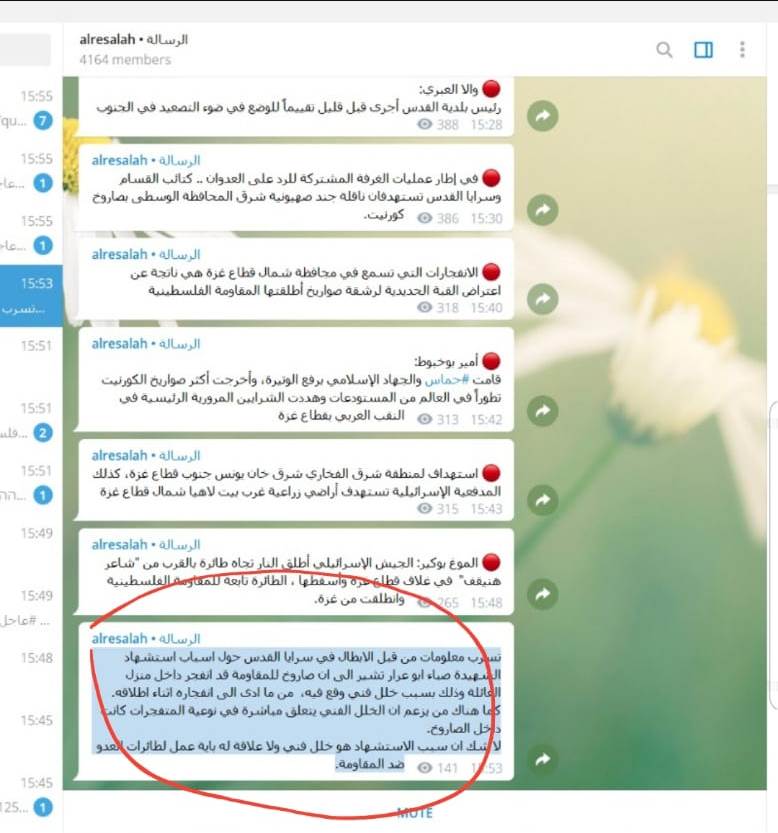 Hamas’ al-Risala News published a news item on the issue in its Telegram account on Sunday afternoon, but removed it shortly after. The item then appeared on another Hamas-lined Telegram channel and quickly disappeared.