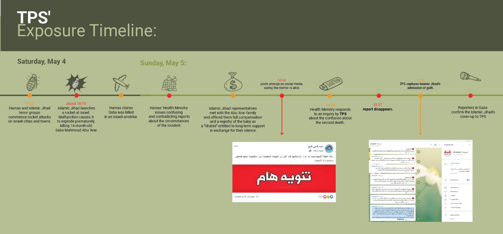 The item says: “A leak from the heroes of the [Islamic Jihad’s] Sarayat al-Quds (Jerusalem Brigades) on the circumstances of the death of the baby Saba Abu ‘Arar indicates that a rocket of the resistance exploded inside the family’s home due to a technical failure, and prematurely exploded. There is a claim that the technical failure was caused by low-grade explosives in the rocket.”