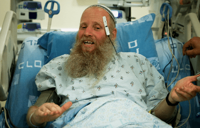 Rabbi Eitan Shnerb speaks to the media at the Hadassah Ein Kerem Hospital, a day after being wounded in a terrorist bombing while hiking that killed his 17-year-old daughter Rina and wounded his 19-year-old son Dvir, on Aug. 24, 2019. Photo by Flash90.