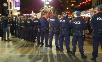 protest1In spite of the court ruling, PAG made the decision to go ahead with their planned protest, but changed the venue to Taylor Square, some 400 metres away from the Verona, out of sight and out of earshot. Technically, the court order did not actually prohibit the protest but removed the immunity from prosecution that protesters otherwise have for disrupting traffic and obstructing the public. Despite all the mainstream media publicity, and claims that 1,000 people would protest, only about 150 turned up. A similar number of police attended to ensure public order was maintained.