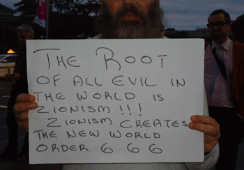 At Taylor Square, placards from previous rallies re-emerged, and there were new ones. One new placard read: “The root of all evil in the world is Zionism!!! Zionism created the new World Order 6 6 6”. This is a bizarre accusation that the Jewish right to national self-determination in their homeland is not only evil, but the root of all evil. The numbers 666 is from the Christian Book of Revelations and is said to be the number of the Devil. Demonisation doesn’t get cruder than that.