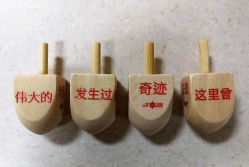 The Dreidels are probably the first ones that have Chinese text on them which appears as follows: