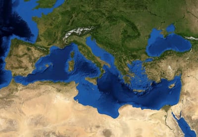 A satellite image of the Mediterranean Sea. The future Israel-Europe gas pipeline will run 1,200 miles undersea between the Jewish state and Italy. Credit: Eric Gaba/NASA World Wind.