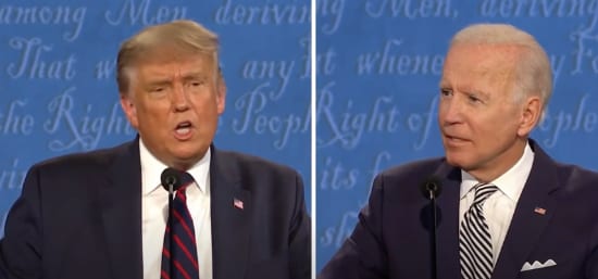 U.S. President Donald Trump and Democratic presidential nominee former U.S. Vice President Joe Biden at the first presidential debate on Sept. 29, 2020. Source: Screenshot.