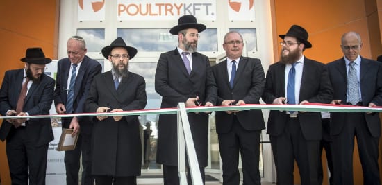 Members of the rabbinic team at the ribbon-cutting ceremony at Csengele kosher slaughterhouse opening in Hungary, July 2020. Chief Ashkenazi Rabbi David Lau is at center; Chabad Rabbi Shlomo Köves of Hungary is second from right. Photo by Zsolt Demecs.