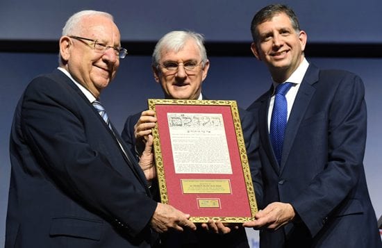 Chairman Keren Hayesod-UIA World Board of Trustees Steven Lowy and World Chairman Keren Hayesod-UIA Sam Grundwerg made a special presentation to President Rivlin of a copy of the first KH-UIA manifest published around the world to mark the organisation’s centenary. Created on 23 December 1920, the manifest was signed by key dignitaries including Haim Weitzman – Israel’s first President and Zeev Jabotinsky – the Founder of Betar.