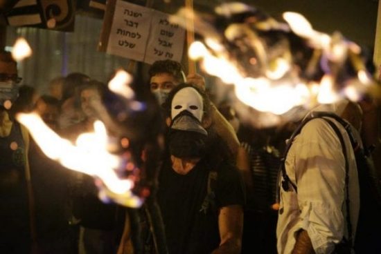 Thousands of protesters waving flags and holding posters gathering in front of Prime Minister Benjamin Netanyahu’s official residence in Jerusalem, calling for his resignation over the government’s economic policies amid coronavirus crisis and his corruption trial. Jerusalem, Aug 1, 2020. Photo by Yehonatan Veltzer/TPS