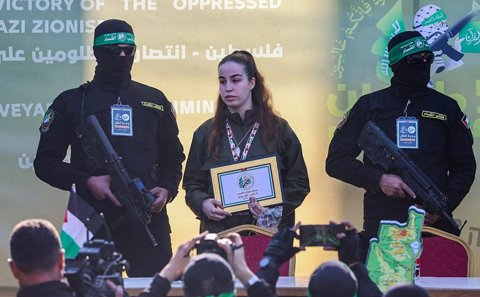 Hamas terrorists escort Israeli hostage Agam Berger (C) on a stage before handing her over to a Red Cross team in Jabalia on Jan. 30, 2025, as part of their third hostage-terrorist exchange. Photo by Omar al-Qattaa/AFP via Getty Images.