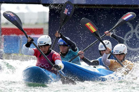 Noemi Fox of Australia, Jessica Fox of Australia, Martina Wegman of the Netherlands and Maialen Chourraut of Spain at the start of their heat in the Women Kayak Cross of the Canoeing Slalom competition 04 August 2024. Pic: EPA/Maxim Shipenkov
