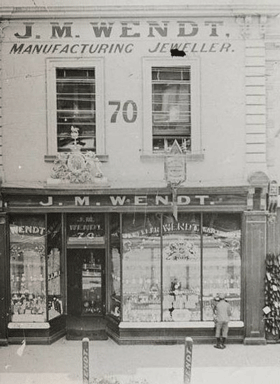 He was the son of Joachim and Christina. She died when Joachim was nine years of age. He was brought up by his father and two sisters and became apprenticed to a watchmaker and learned the silversmith’s craft. In 1848 Holstein was conquered by Prussia. He found German rule so unpleasant that he emigrated to South Australia, arriving at Port Adelaide in 1854 and establishing himself as J M Wendt – watchmaker and jeweller. He opened his first business in Pirie Street, moving on to bigger premises at 68 Rundle Street in 1861 and a further move to 70 Rundle Street in 1874. The business became an extremely successful and well-known one for over one hundred years.