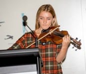 Jorn Utzon whose moving hands presented the look of an olive wreath. He gave the instrument to Ashleigh who played the Schnindler theme under the Arbeit Macht Frei sign at Auschwitz-Birkenau where her great-grandfather, the violin’s original owner had been murdered. Ashleigh Vissel was at Masada College at the time and was participating in the March of the Living.