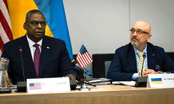 U.S. Secretary of Defence Lloyd J. Austin III and Ukrainian Minister of Defense Oleksii Reznikov at NATO headquarters, Brussels, June 15, 2022. Credit: Chad J. McNeeley/DoD.